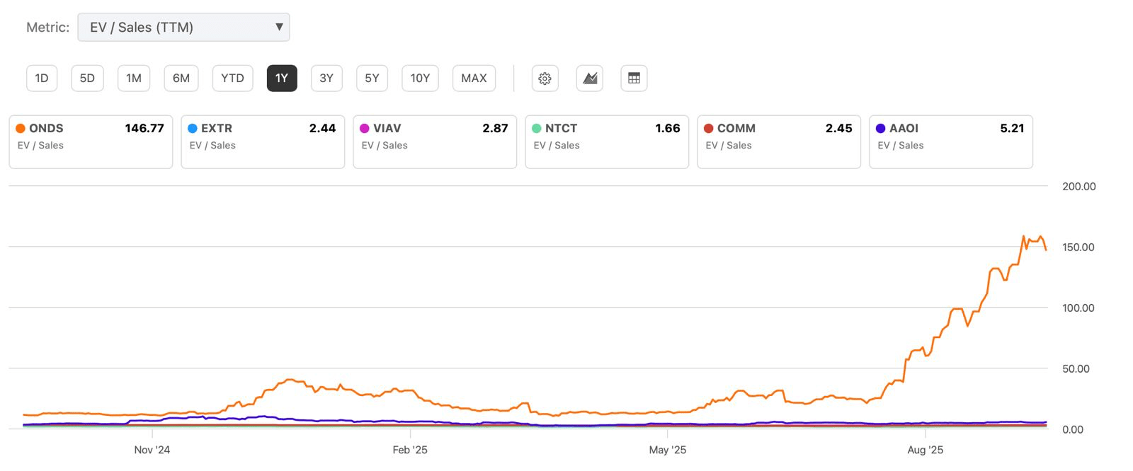 Despite strong revenue growth and strategic contracts, Ondas trades at an extreme valuation (approximately 150x EV/sales), leaving little margin for error and significant downside risk.